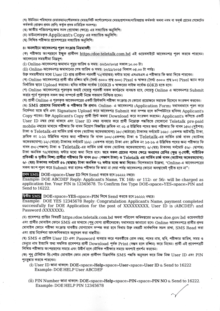 প্রার্থীদের শুধুমাত্র অনলাইনেই আবেদন করতে হবে। অন্য কোনো মাধ্যমে প্রেরিত আবেদন গ্রহণ করা হবে না।আবেদন লিংক: https://doe.teletalk.com.bd