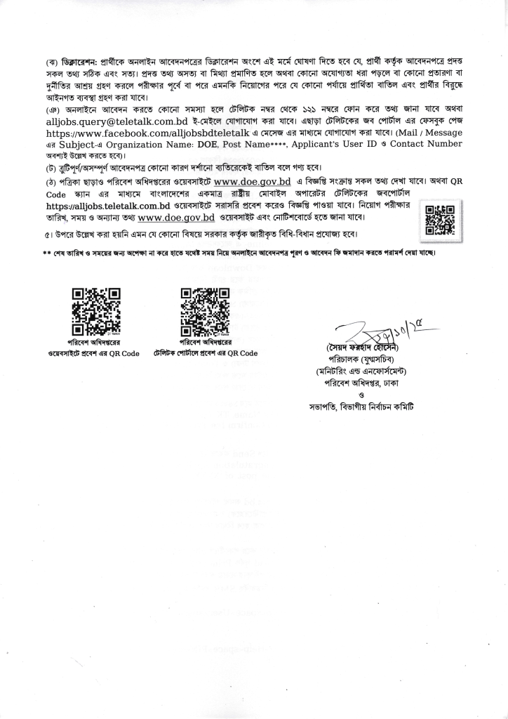 আমাদের শেষ কথা – পরিবেশ অধিদপ্তর নিয়োগ বিজ্ঞপ্তি ২০২৫ – doe.teletalk.com.bd