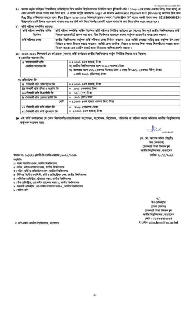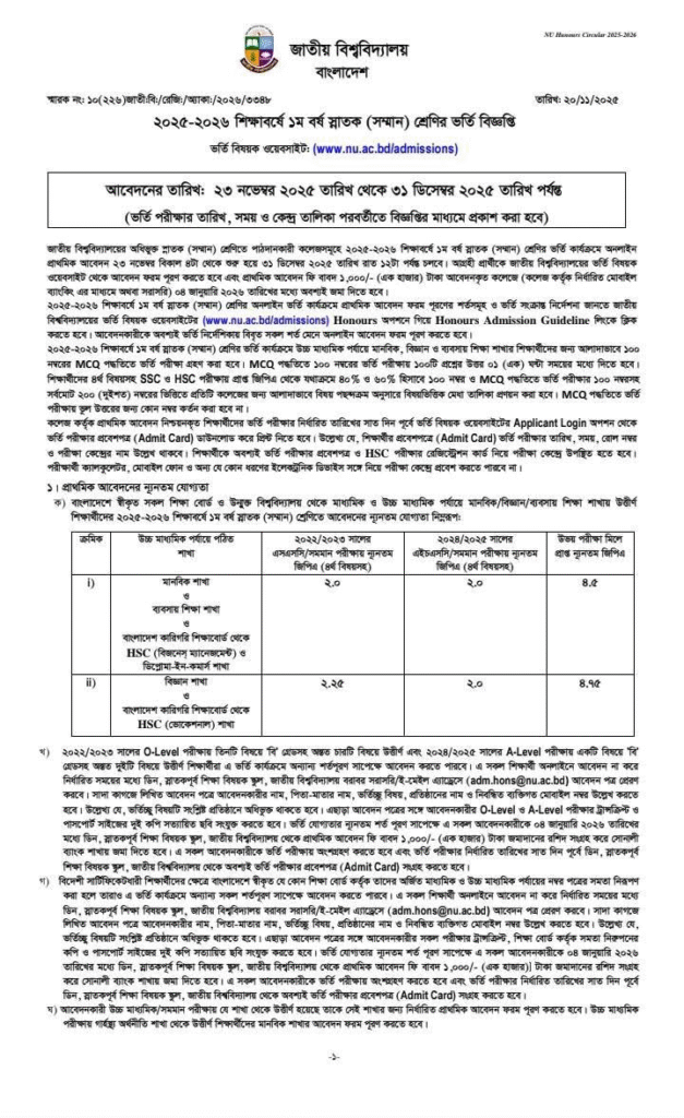 জাতীয় বিশ্ববিদ্যালয়ের অনার্স (২০২৫-২৬) শিক্ষাবর্ষের ভর্তির সার্কুলার প্রকাশিত হয়েছে। জাতীয় বিশ্ববিদ্যালয়ের অনার্স (২০২৫-২৬) শিক্ষাবর্ষের ভর্তির আবেদন শুরু: ২৩ নভেম্বরআবেদন শেষ: ৩১ ডিসেম্বরআবেদন শেষ: ৩১ ডিসেম্বর